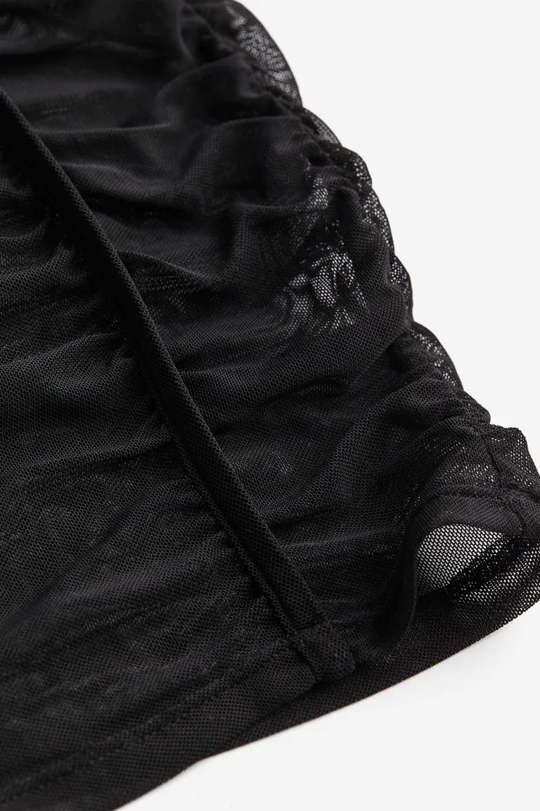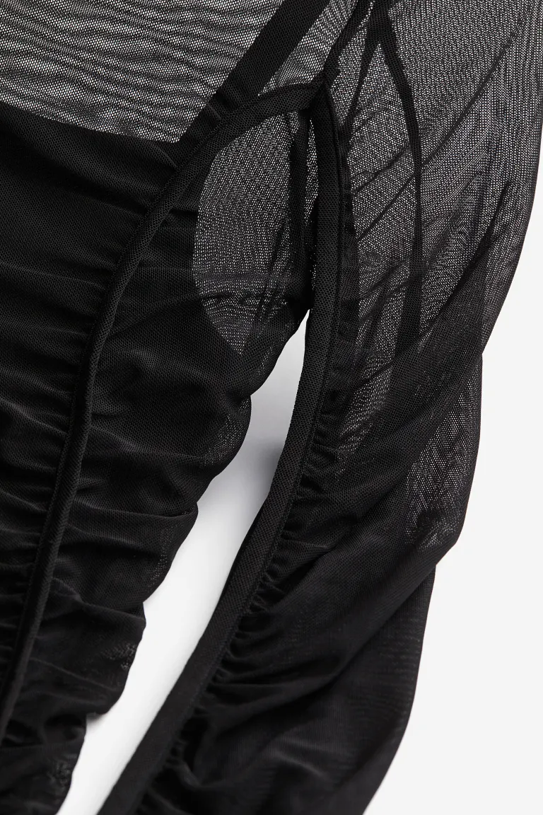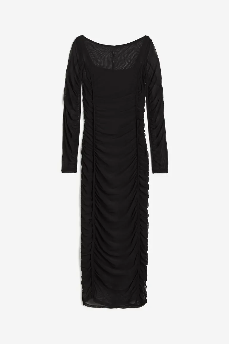 Calf-length, fitted dress in mesh with a wide neckline and long sleeves. Gathered seams and decorative piping down the front and sleeves. Liner dress in jersey with narrow shoulder straps and a deep, round neckline.