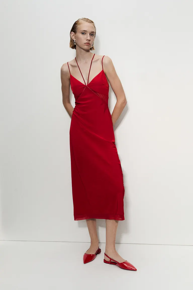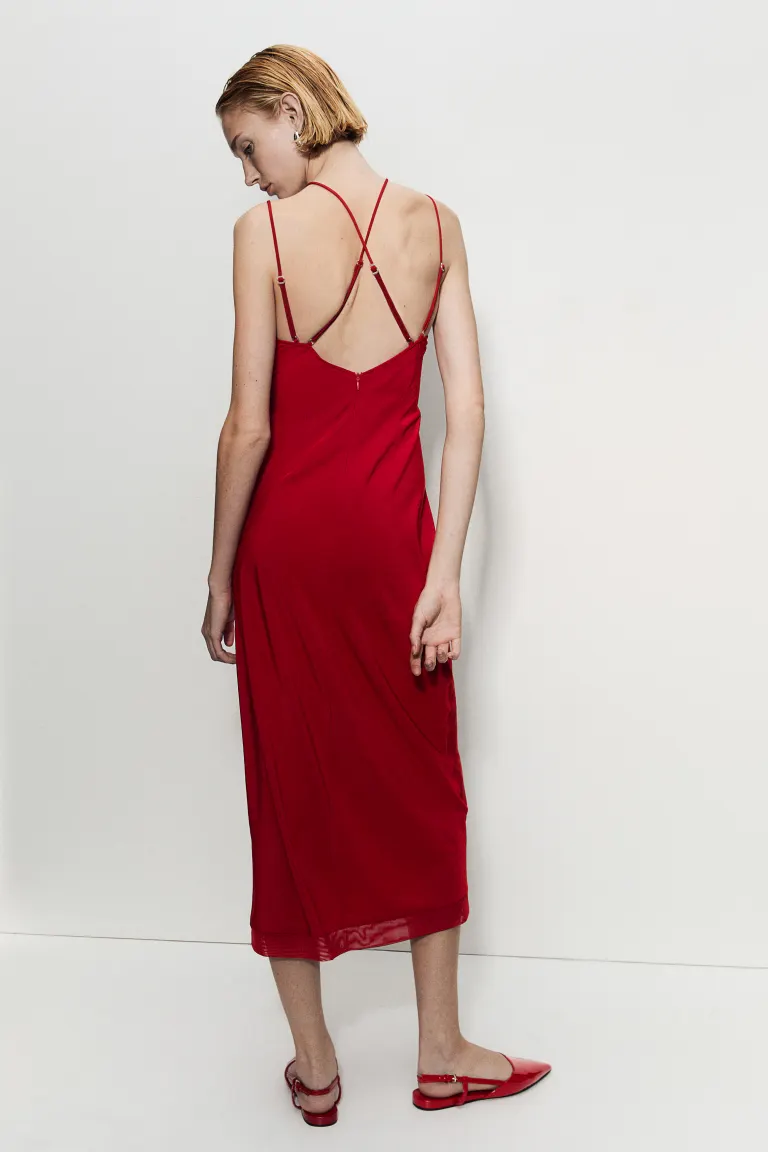 Long, fitted dress in woven fabric with mesh insets below the bust and at the hem. Double, adjustable spaghetti shoulder straps, two of which cross at the back. Concealed zip at the back. Lined over the bust.
