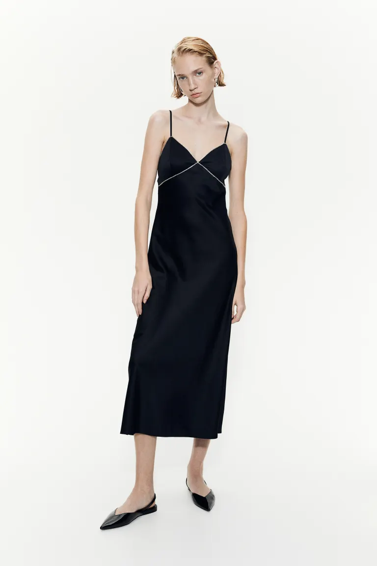 Calf-length dress in softly draping satin decorated with sparkling rhinestone chains around the neckline and below the bust. V-shaped neckline, narrow, adjustable shoulder straps, shaped cups and a concealed zip at one side. Fitted bodice and a gently flared skirt. Lined over the bust.