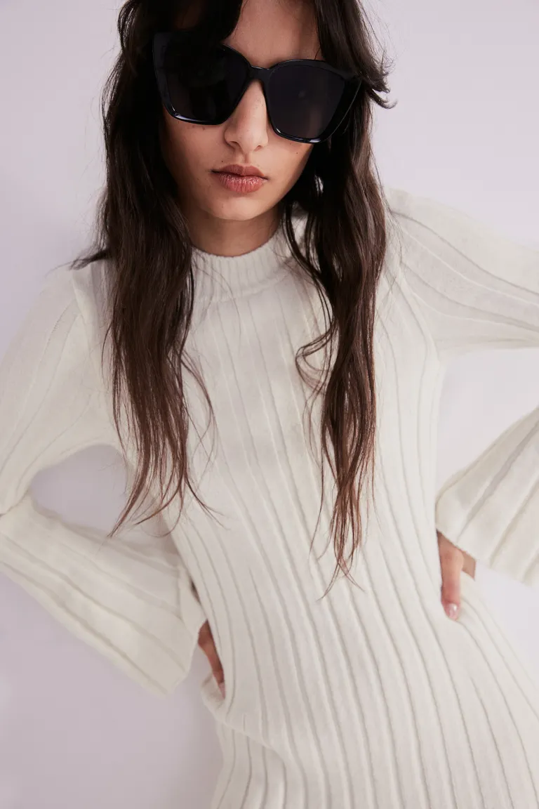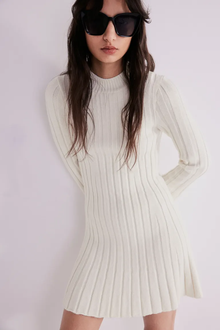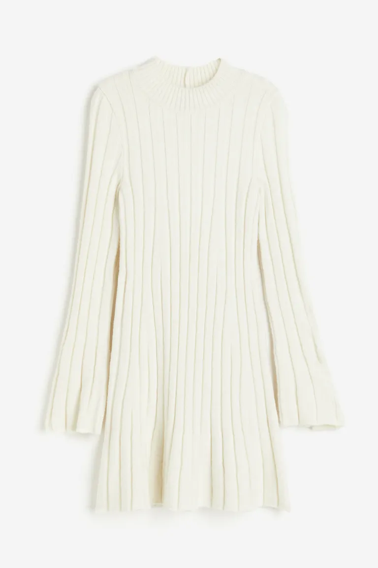 Short dress in a fine, rib knit containing some wool. Round neckline with narrow ribbing, long trumpet sleeves, a fitted bodice and a gently flared skirt.