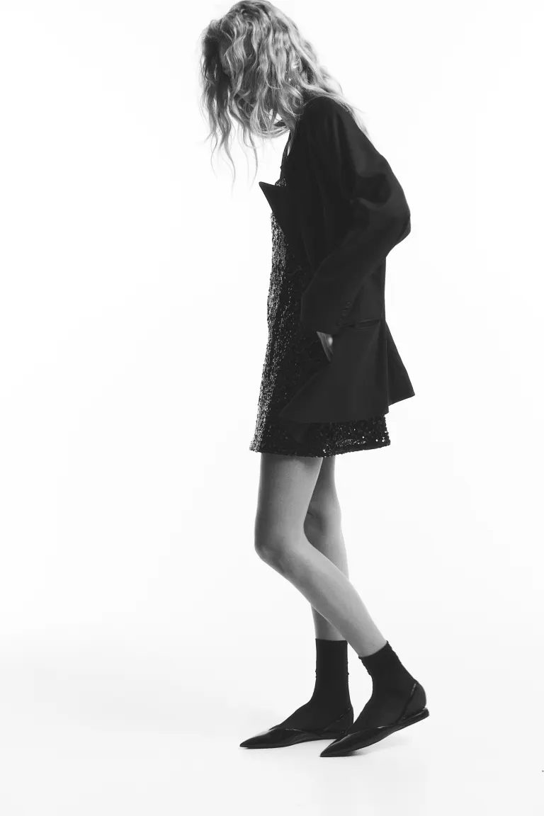 Short, fitted dress in sequined mesh with a deep, round neckline and narrow, adjustable shoulder straps. Fitted bodice and a gently flared skirt. Lined.