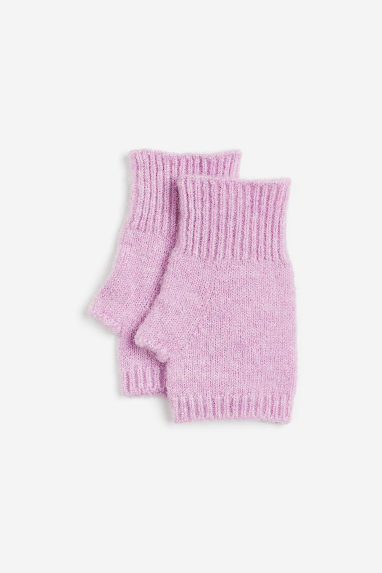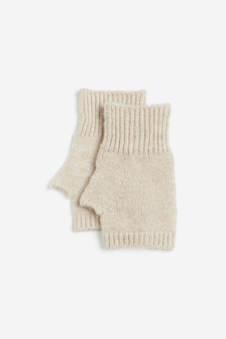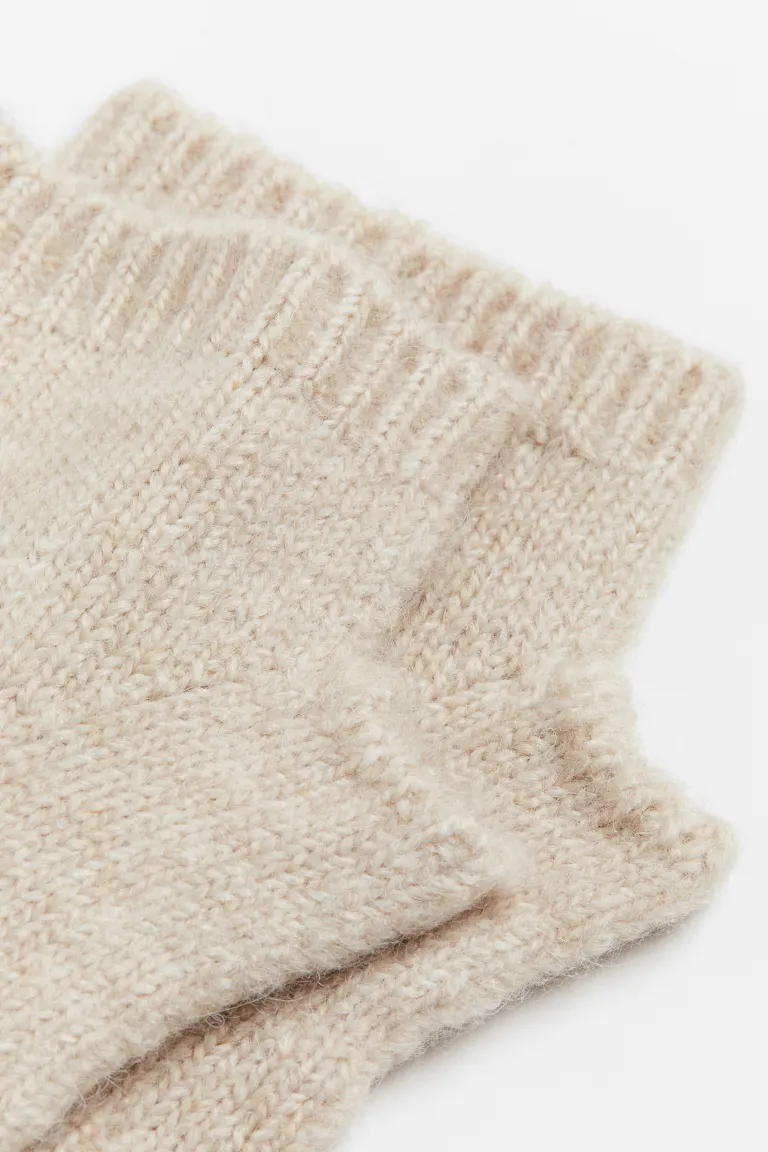 Wrist warmers in a soft knit containing some wool with thumbholes and ribbed trims at the top and bottom.